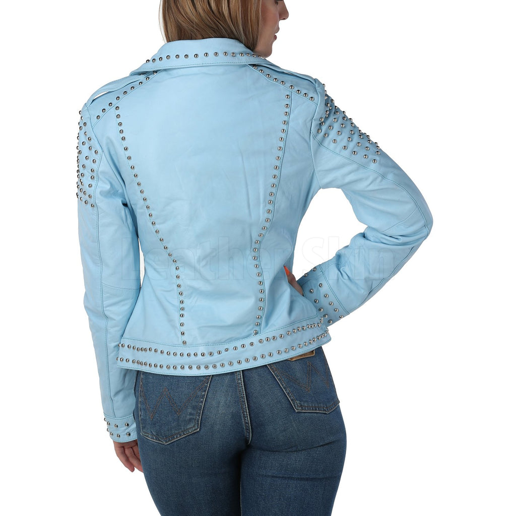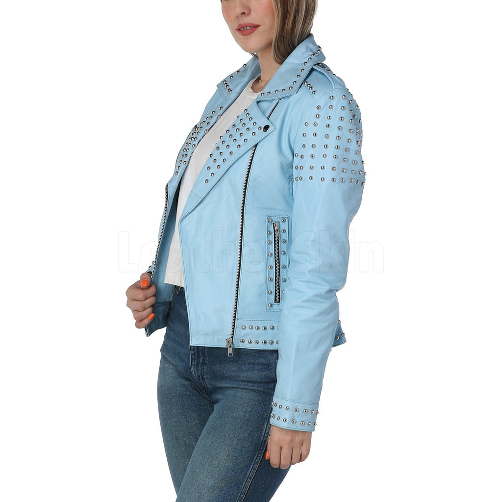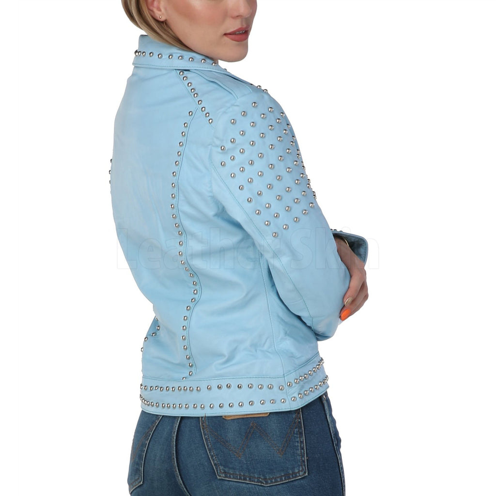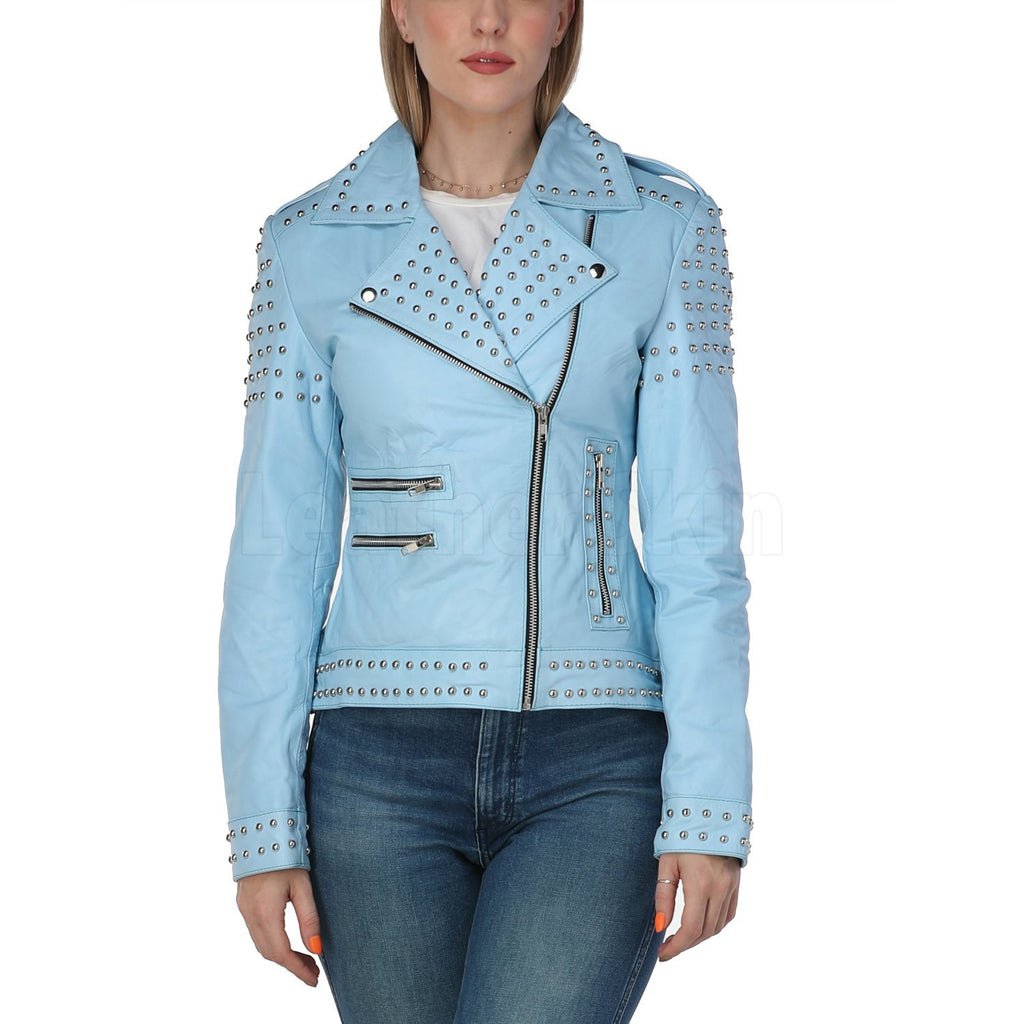Charming, appealing, and aesthetic leather jackets take you to wonderful places. If you wish to experience all this and more, we at Leather Skin Shop have got just the perfect stuff for you. Our Women Sky Blue Studded Leather Jacket is your gateway to closet heaven.