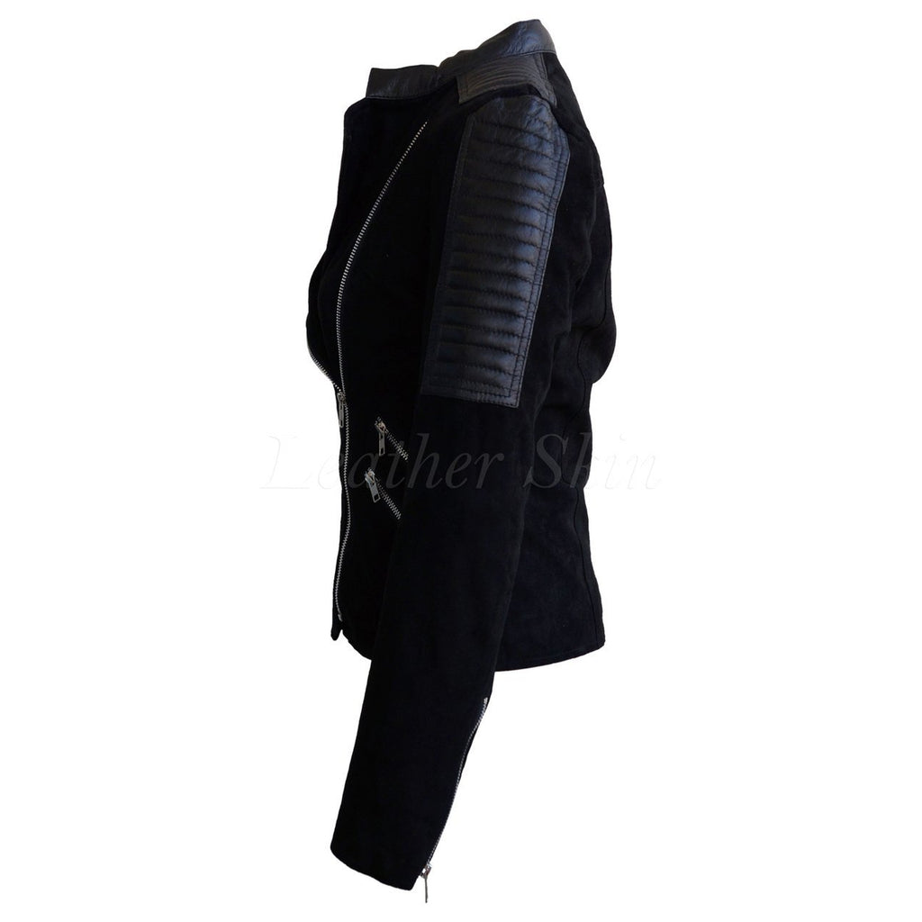 Leather Skin Women Black Brando Suede Sleeve Shoulder Padded Leather Jacket