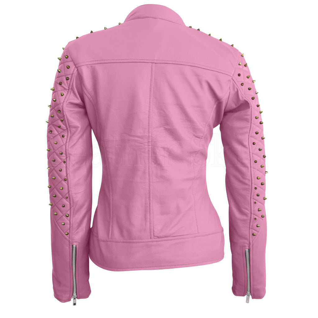 Leather Skin Women Pink Quilted Gold Studded Skeletons Genuine Leather Jacket