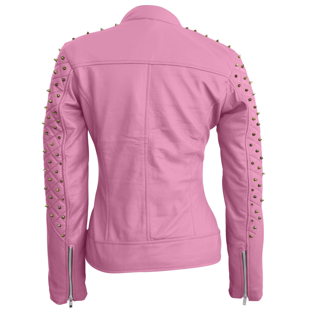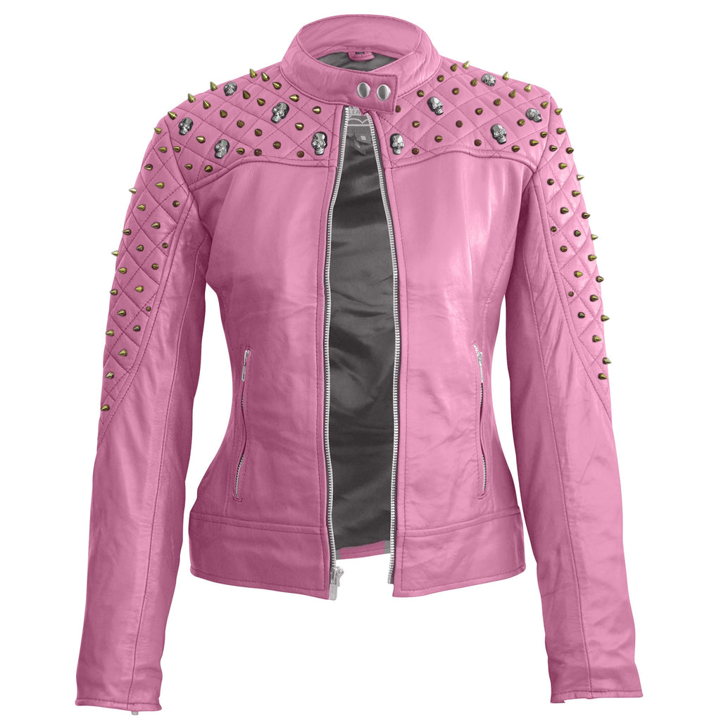 Leather Skin Women Pink Spike Skeleton Studs Genuine Leather Jacket
