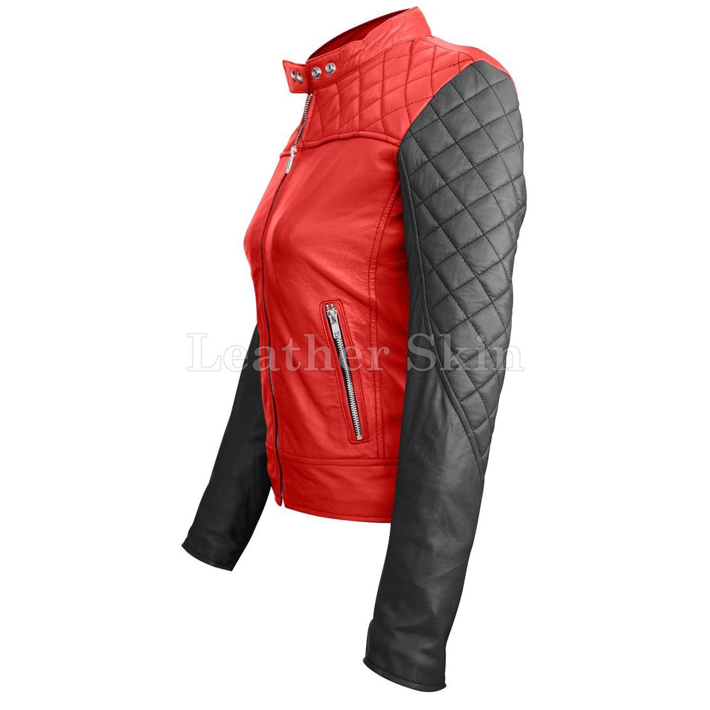 Leather Skin Women Red with Black Sleeves Shoulder Quilted Genuine Leather Jacket