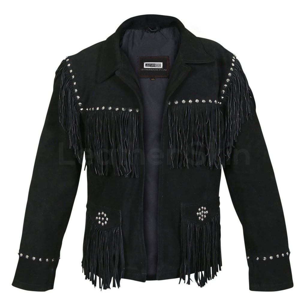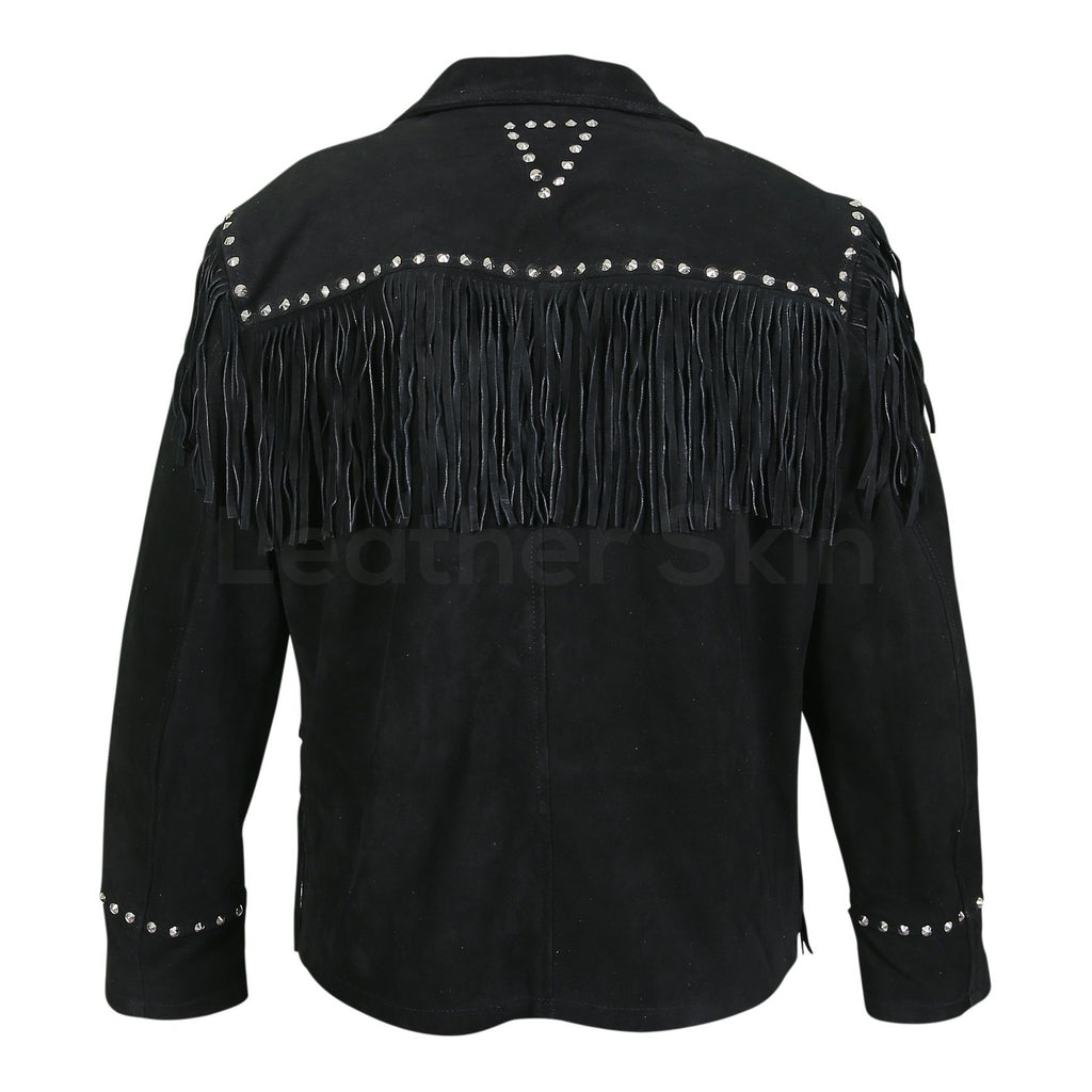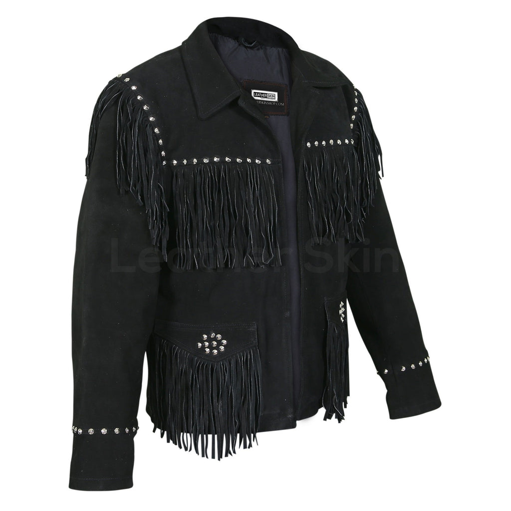 Women Black Western Fringes Cone Spike Studs Suede Leather Jacket