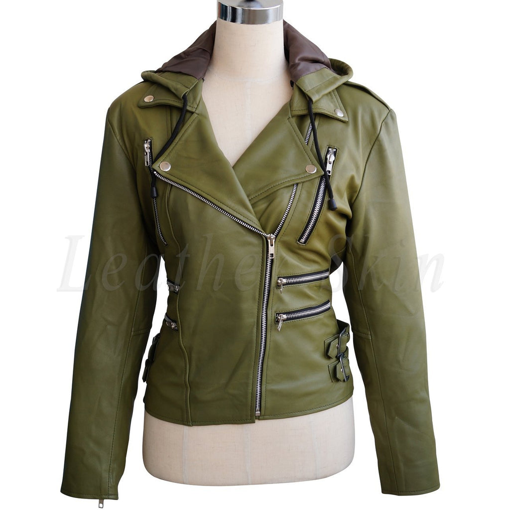 Olive Green Brando Genuine Leather Jacket with Detachable Hood